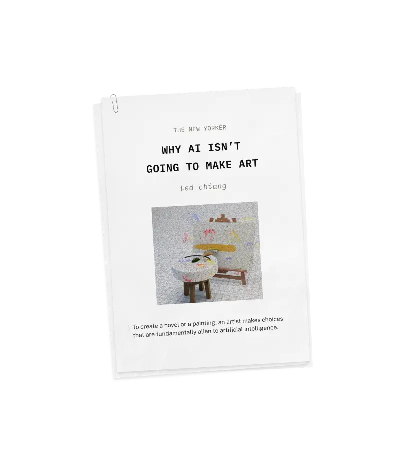 Fiction author Ted Chiang writes about intentionality in art (from writing, to music, to visual art) and the creative process. It came out in 2024, but we think it’s more relevant than ever with AI and LLMs settling into our lives – and invites a reflection into human creativity itself.